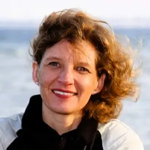 Frau (Eva Strehler) lächelnd in Motorradkleidung, im Hintergrund Meer